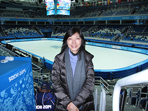 ソチのリンクで取材中の田村明子さん。フィギュアスケートを取材して20年以上というキャリアのジャーナリストである。