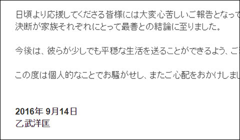 〈皆様へ〉と離婚を発表(乙武氏のサイトより)