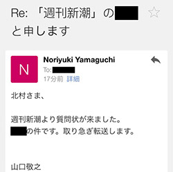 「北村さま、週刊新潮より質問状が来ました。◎◎の件です」