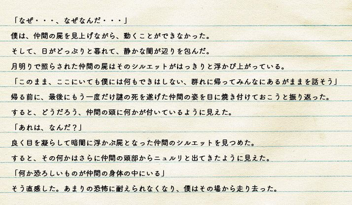 今回、恐怖のどん底に落とされた主人公はブラジルの熱帯雨林などに住む「カーペンターアリ」です。群れを離れて、ふらふらと歩きだした仲間は、この時すでに「あるもの」に心も体も乗っ取られていました。その「あるもの」とは「キノコ」や「カビ」の1種です。鍋に入れたり、焼いたり、炒めたりするだけで簡単に美味しくいただけるあのキノコの仲間です。