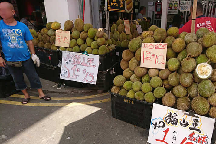 春節期間のチャイナタウン。本来であれば中国人が愛してやまない果物の王様=ドリアンの最高品種「猫山王(ムサンキング)」も、中国人観光客の激変で、閑古鳥が鳴いている。(1月27日、筆者撮影)
