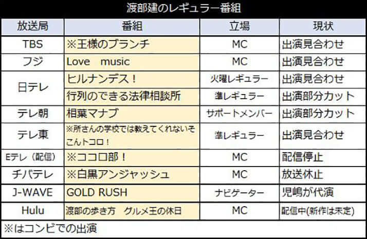 「さらにパネラーとして出演している『ヒルナンデス!』(日本テレビ)は15万円、『行列のできる法律相談所』(同)は30万円、『相葉マナブ』(テレビ朝日)が25万円、Hulu配信でBS日テレでもやっている『渡部の歩き方 グルメ王の休日』は20万円といったところでしょうか。ラジオやゲスト出演もありますから、週に250万円、年間1億2500万円といったところでしょう」