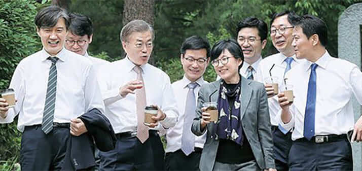 大統領府内を散歩中のひとこま。右端が、統一部長官の李仁栄氏