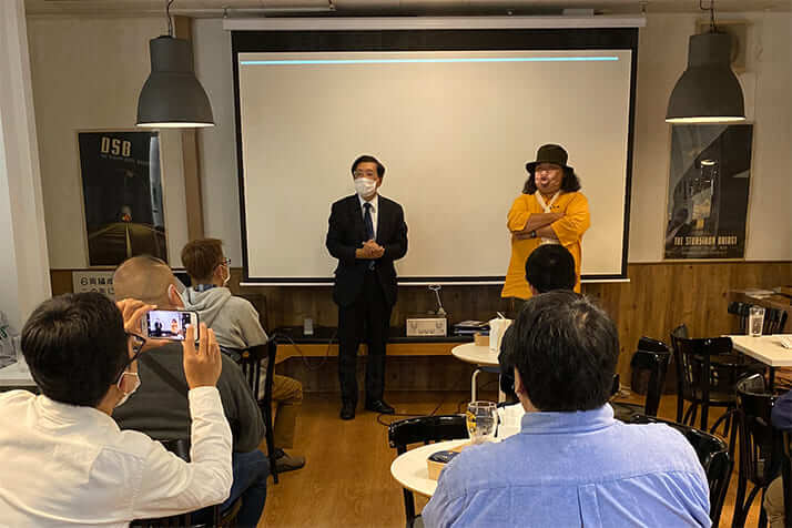 2枚目/2枚中 経営難の「銚子電鉄社長」が、前澤友作氏に支援要請の手紙 まさかの“反応”が…… 社会2020年10月12日 東京都荒川区の「都電カフェ」で行われた上映会後のトークイベントで、「電車を止めるな!」の制作秘話を明かす竹本社長(左) 0