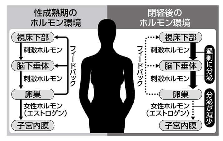 「これに加えて自律神経が乱れます。卵巣がエストロゲンを出すためには、まず脳の視床下部が刺激ホルモンを出す。これを受けて脳下垂体がまた別の刺激ホルモンを出す。それを受けた卵巣がエストロゲンを放出するという仕組みです。卵巣が寿命を迎えて働けなくなるのが更年期。いくら刺激ホルモンを受けても、エストロゲンが出なくなる。脳はおかしいと感じて“頑張れ頑張れ”と、過剰に刺激ホルモンを出すことになる(掲載の図参照)。脳下垂体の周辺には自律神経の中枢があるので、これによって自律神経がアンバランスになるのです」(同)
