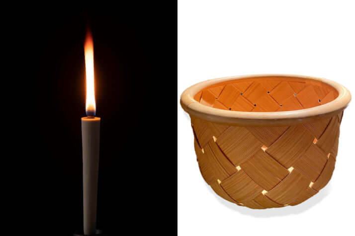 (左)創業200年余、伝統の工法で手作りされる飛騨古川、三嶋屋の和蝋燭。ジョブズは坐禅時に使っていた。写真/広瀬達郎(「芸術新潮」編集部)、(右)“あったかい日本”を感じさせる藤井啓太郎作・籐籠。ジョブズは、本や雑誌を入れていたようだ。写真©柳田由紀子