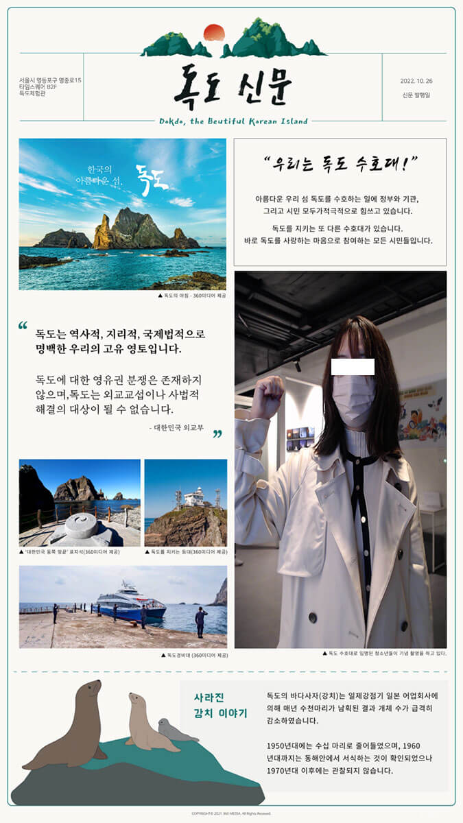 5枚目/6枚中 韓国の「独島体験館」が2倍の広さに拡張されていた 子供向け展示が充実で「次世代にも偽りの歴史が…」と危惧する声 韓国・北朝鮮2022年11月28日 「我らは独島守護隊」と書かれた新聞に来館者が顔写真を載せられるコーナーも 0
