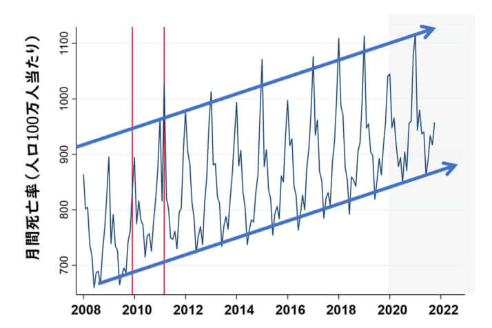 3枚目/4枚中 ワクチン接種で死亡者数急増は本当か? 専門家が「日本は超過死亡率が最も少ない国のひとつ」と説く理由 社会2022年12月05日 過去14年間、死亡率は右肩上がりで上昇(浦島充佳教授・作成) 0