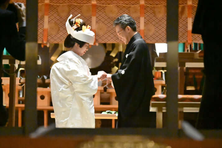 一般参拝者からも見える本殿内で、愛を誓った二人