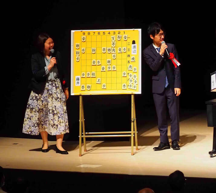 大盤解説中の加藤桃子女流三段と古森悠太五段(撮影・粟野仁雄)