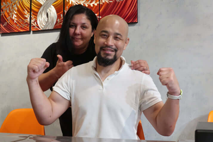 9枚目/9枚中 “世界ヘビー級王座”を目指した「西島洋介さん」が明かす“名物会長”との知られざる絆 伝説の多くは“演出”でも「師匠には感謝しかない」 スポーツ2023年10月09日 マネージャー・アンナさんと笑顔のワンショット 0
