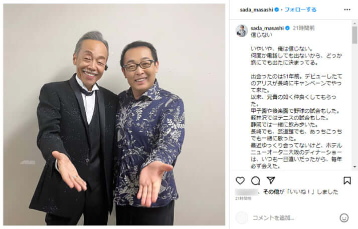 5枚目/5枚中 追悼・谷村新司さん 吉田拓郎から「信用できねぇ」と突っかかられて…筆者に語った爆笑エピソード 芸能2023年10月18日 さだまさし・公式Instagram(@sada_masashi)より 0