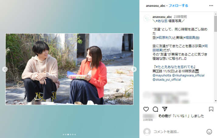 8枚目/8枚中 「たとえあなたを忘れても」は「silent」と似ている…PRコメントはパクリで謝罪、外れたABCテレビの思惑 芸能2023年11月05日 「たとえあなたを忘れても」公式Instagramより 0