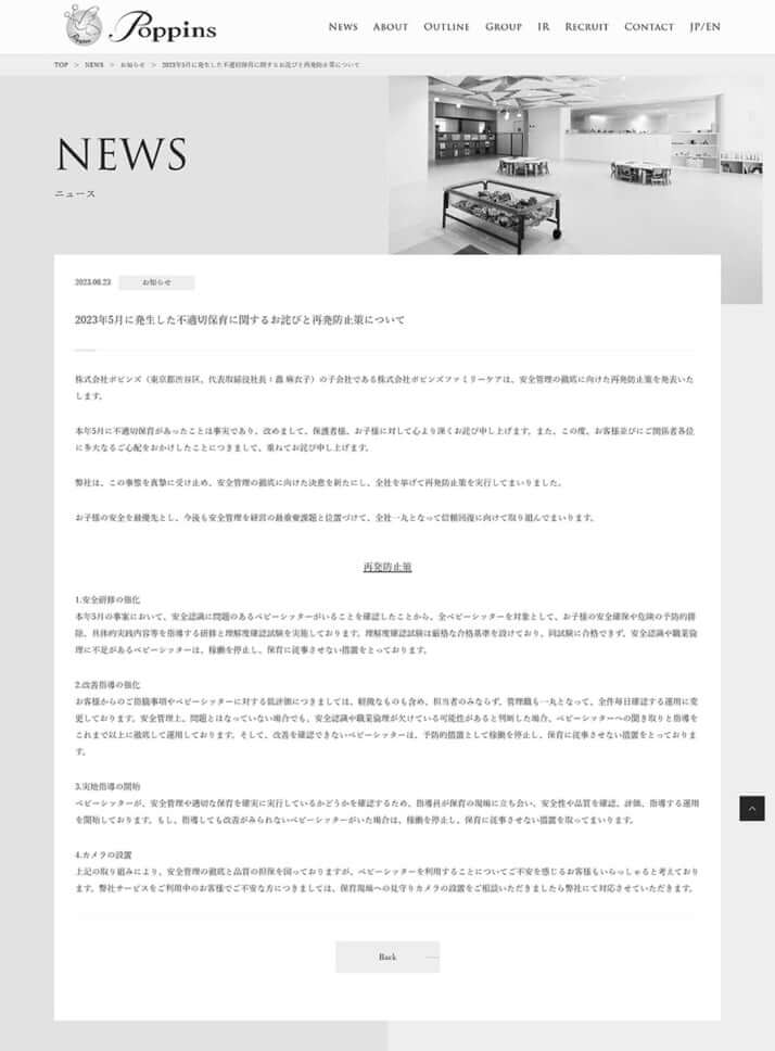 6枚目/10枚中 「あなたバカなの?」「顔と目もうざい」、土下座を強要…ベビーシッター大手ポピンズ74歳「元女子アナ」会長が猛烈パワハラで告発されていた 社会2023年11月24日 シッターの暴行容疑での逮捕を受けての再発防止策(ポピンズのHPより) 0