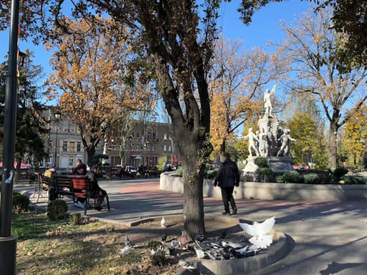 11枚目/20枚中 空襲警報が鳴っても平然と買い物…戦場から20kmの町で聞いた市民の本音【ウクライナ最前線リポート】 国際2023年12月10日 ミサイルが命中した建物のすぐ向かいにある公園。いつもと変わりなくベンチで憩う人々がいる
