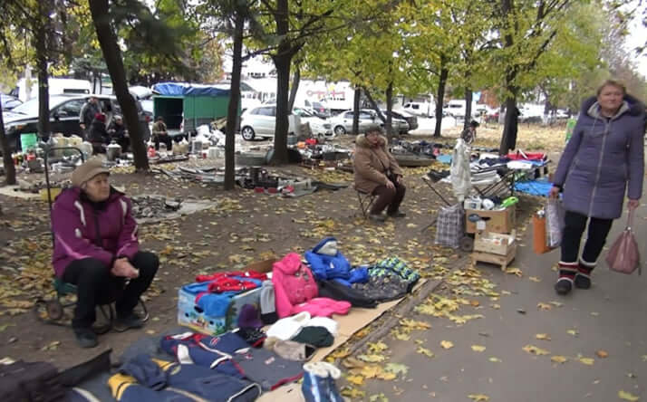 13枚目/20枚中 空襲警報が鳴っても平然と買い物…戦場から20kmの町で聞いた市民の本音【ウクライナ最前線リポート】 国際2023年12月10日 フリーマーケット。「商品」をならべているのは高齢者が多い(クラマトルスク市)