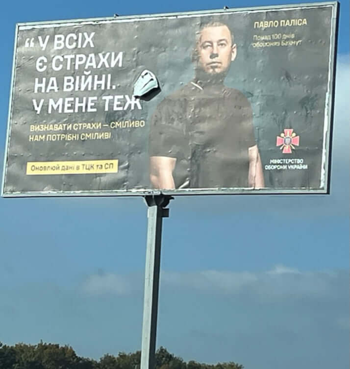「戦争は誰にとっても恐怖です。私にとっても」と書かれた国防省の掲示板。肖像写真はロシア軍と最前線で対峙する第93独立機械化旅団のパブロ・パリサ旅団長