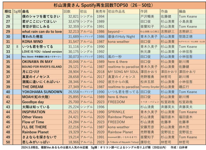3枚目/10枚中 「これ以上やっても、過去の自分の焼き直し…」十年前の気づきがもたらした、杉山清貴の新しい可能性 芸能2024年06月12日 杉山清貴さん Spotify再生回数TOP50(26-50位) 0
