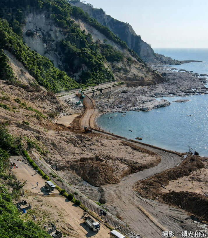 4枚目/47枚中 【能登半島地震から半年】自衛隊の派遣日数は東日本大震災超え 「置き去り」にされた被災地の厳しい現実 社会2024年07月01日 能登半島を一周する国道249号線、珠洲市仁江町の土砂崩れ現場。地震によって隆起した海岸を利用して新たな道が造られていた。 撮影・頼光和弘 0