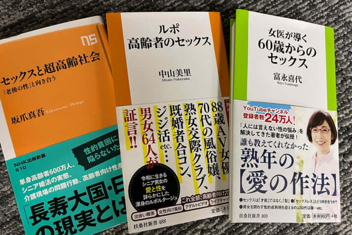 いま書店に行くと、“高齢者の性”についての本が多いことに気づく。おなじ著者による『ルポ 高齢者のセックス』(中山美里著、扶桑社新書)、『セックスと超高齢者社会』(坂爪真吾著、NHK出版新書)、『女医が導く60歳からのセックス』(富永喜代著、扶桑社新書)……。そのほか、男性サラリーマン向け週刊誌には、最近でこそ少なくなったが、「死ぬまでセックス」「どこまでも性を楽しんで生きる」といった記事があふれていた。