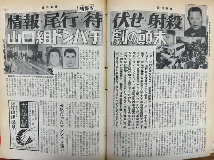 【写真12枚】事件を伝える当時の「週刊新潮」と「FOCUS」の誌面。レトロな字体で「情報・備考・待ち伏せ・射殺 山口組ドンパチ劇の顛末」と伝えている
