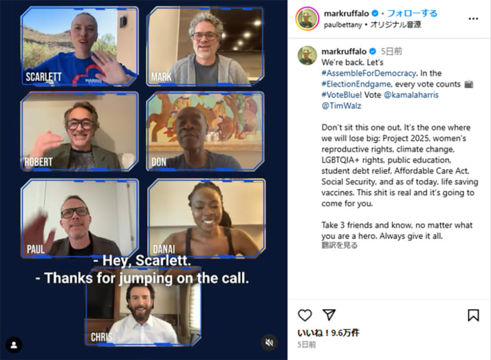 3枚目/6枚中 「トランプ支持」を貫いたハリウッド俳優たち “ハリス旋風”が席捲した業界で何を訴えていたのか 国際2024年11月07日 ハリス支持を訴えて再結集した「アベンジャーズ」俳優7人(マーク・ラファロ公式Instagram)より) 0