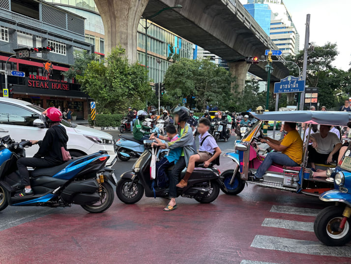 6枚目/7枚中 日本人インフルエンサーが交通事故死… バンコクの「超便利だが危険すぎる」移動事情 国際2025年01月11日 こちらはバイクタクシーではないが……3人乗りのバイクもときどき見かける(撮影・澤野綾香) 0