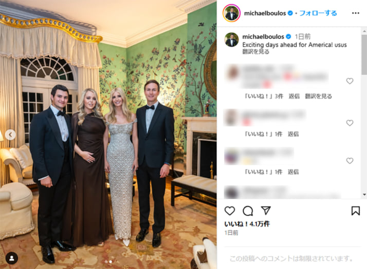 4枚目/6枚中 トランプ大統領を支える「一握りの権力者」 スキルの低い者を「不要」と切り捨てる“デジタル封建主義”が米国民を抑圧する 国際2025年01月23日 次女ティファニー・トランプ氏の夫、マイケル・ボウロス氏の公式Instagram(@michaelboulos)より 0
