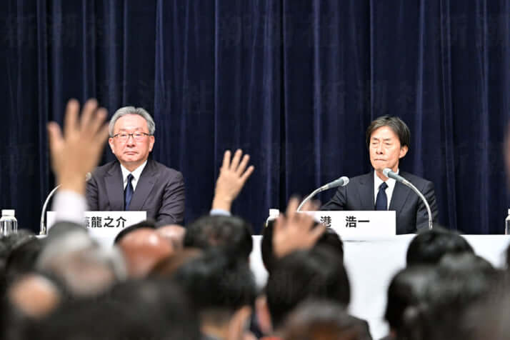 記者会見には、直前の臨時取締役会で辞任したフジテレビ港浩一社長と嘉納修治会長(親会社フジ・メディア・ホールディングス会長を兼務)と並んで、遠藤龍之介副会長と金光修ホールディングス社長、フジテレビ新社長に選ばれた清水賢治ホールディングス専務の5人が揃った。...