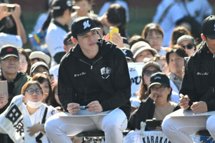 6枚目/6枚中 宮城でも今井でも高橋宏でもなく…MLBが次に狙う意外な投手 今オフ渡米要求でも「拒絶できない」球団事情とは? 野球2025年03月14日 ロッテのファン感謝デーに登場した佐々木朗希投手 0