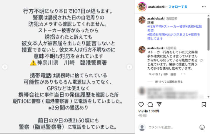 7枚目/7枚中 【川崎・住宅から白骨化遺体】神奈川県警の後手対応にOB刑事の苦言 なぜ4カ月を要したのか…真っ先に疑うべき元交際相手 社会2025年05月02日 被害者家族が開設したインスタグラムより 0