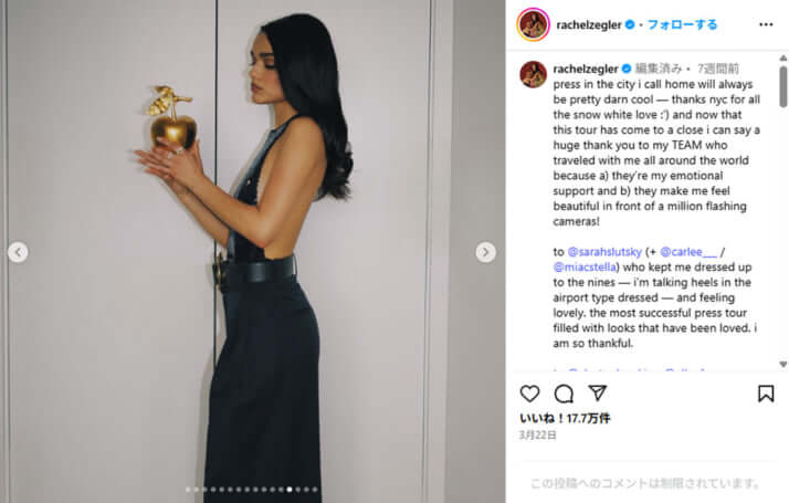 白雪姫を演じたレイチェル・ゼグラー(本人Instagramより)