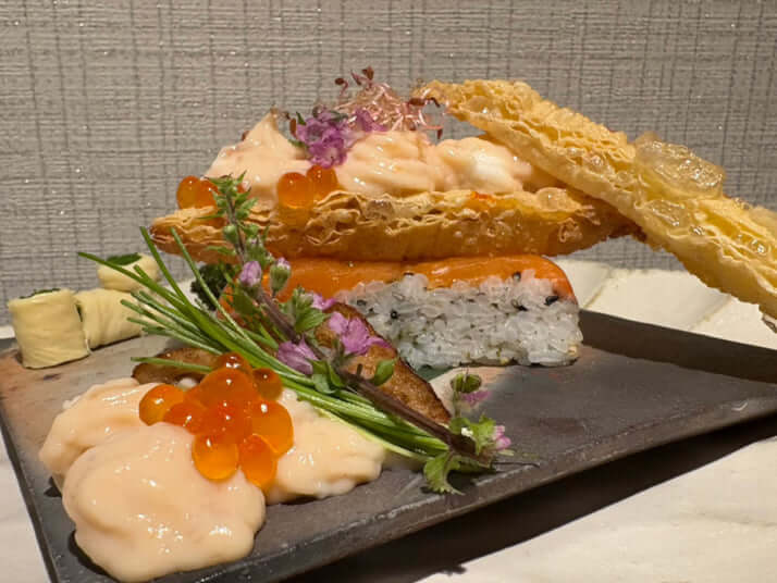 2枚目/5枚中 銀座に店を構えた「女性寿司職人」に世界が注目! 「女性には不向き」の俗説を覆してフランスのドキュメンタリー映画で主演に抜擢されるまで ライフ2025年06月03日 薬膳サーモンなどを使ったミルフィーユ風の創作寿司(千津井由貴さん提供) 0
