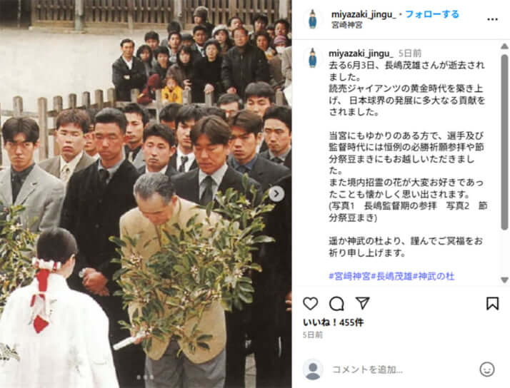 10枚目/11枚中 兄貴だった「長嶋茂雄」さん…よみがえる自主トレ同行の思い出と大切な教え 通夜の席で「丸 佳浩」に思わずかけた言葉とは【柴田勲のコラム】 野球2025年06月10日 宮崎神宮・公式Instagram(@miyazaki_jingu_)より 0