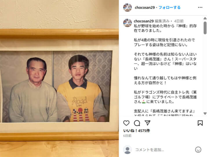 3枚目/11枚中 兄貴だった「長嶋茂雄」さん…よみがえる自主トレ同行の思い出と大切な教え 通夜の席で「丸 佳浩」に思わずかけた言葉とは【柴田勲のコラム】 野球2025年06月10日 前田幸長・公式Instagram(@chocosan29)より 0