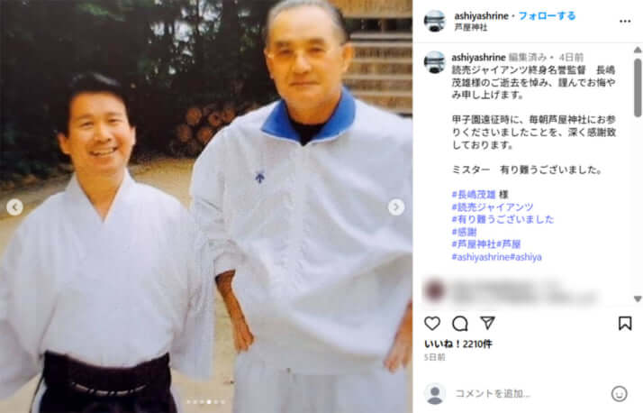 7枚目/11枚中 兄貴だった「長嶋茂雄」さん…よみがえる自主トレ同行の思い出と大切な教え 通夜の席で「丸 佳浩」に思わずかけた言葉とは【柴田勲のコラム】 野球2025年06月10日 芦屋神社・公式Instagram(@ashiyashrine)より 0