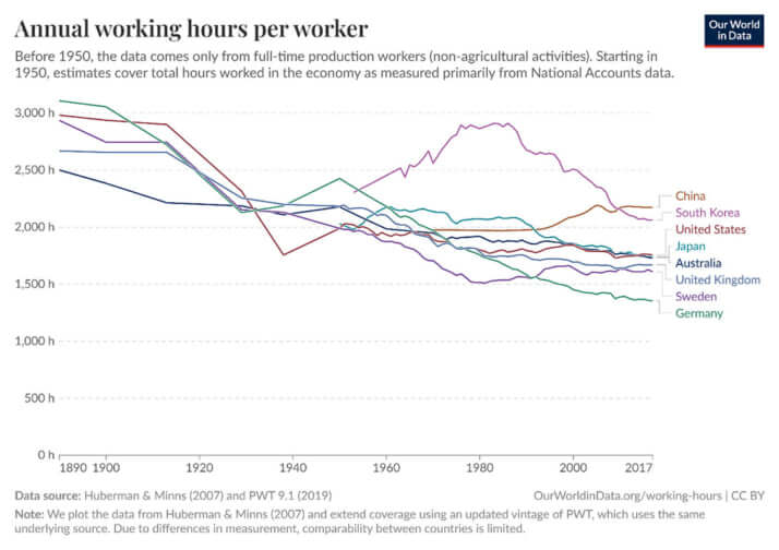 各国の労働時間の推移。ドイツは1950年ごろにどの先進国よりも働いていたが、2017年では労働時間が最も少なくなっている(引用:Our World in Data)