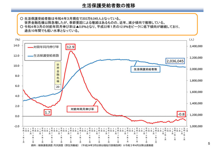 5枚目/5枚中 「生活保護」受給者の55%は「65歳以上の高齢者」…“年金よりも生活保護”で氷河期世代「1700万人」を待ち受ける悪夢のような老後 社会2025年07月03日 受給者数は減少傾向(厚生労働省「生活保護制度の現状について」令和4年6月3日より) 0