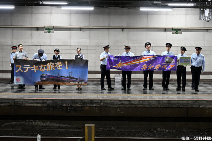 4枚目/11枚中 警官が出動、ロープで制限も… “撮り鉄”対策バッチリの「カシオペア」ラストランでちょっと意外な光景が 社会2025年07月12日 ラストランの日を迎えた寝台特急「カシオペア」を見送る駅員たち 0