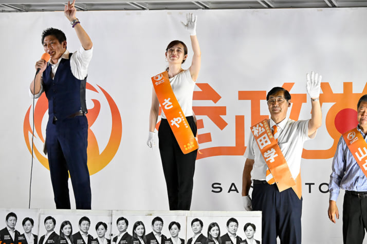 マイク納めで登壇した神谷宗幣党首とさや氏