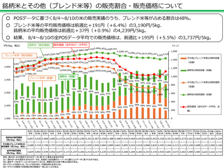 3枚目/5枚中 早くも「新米」高騰で“異色の兼業農家”は「5キロ5400円」を懸念…現実味を帯びる「深刻なコメ離れ」と「ラーメン1000円の壁」の共通点 社会2025年08月26日 農水省の資料「スーパーでの販売数量・価格の推移(KSP-POSデータ全国等)より 0