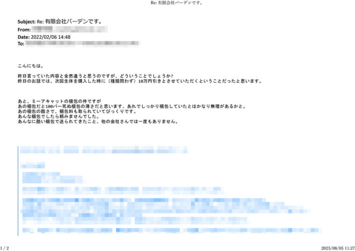 26枚目/27枚中 動物研究家・パンク町田の惨すぎる“動物ビジネス”を元従業員が告発 「ケージは糞まみれで、カピバラが次々死んで…」 社会2025年09月01日 亡くなった状態で到着したミーアキャットの梱包に苦情を述べる顧客からのメール 0