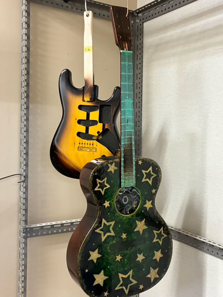 4枚目/6枚中 日本を代表するギターメーカー「ESP」が“職人養成学校”にこだわる理由 「ゼロから教えて、卒業までに25本のギターを作った学生も」 エンタメ2025年09月01日 塗装を終え、乾燥を行っているギター 0