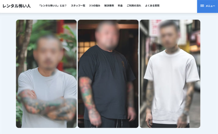 2枚目/6枚中 「レンタル怖い人」即サービス終了で《メンタル弱い人やん》 弁護士は「存在が脅迫行為」「犯罪の勧誘」のリスク指摘 社会2025年09月06日 迫力満点のスタッフたち(「レンタル怖い人」公式ホームページより) 0
