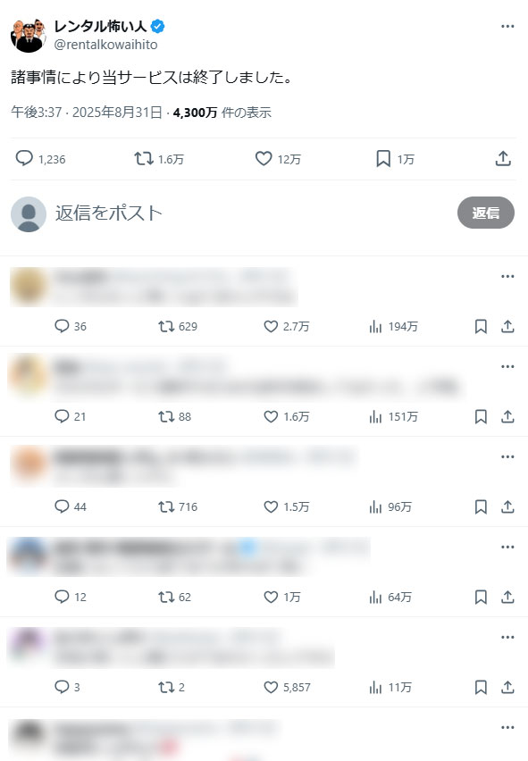 3枚目/6枚中 「レンタル怖い人」即サービス終了で《メンタル弱い人やん》 弁護士は「存在が脅迫行為」「犯罪の勧誘」のリスク指摘 社会2025年09月06日 終了の8月31日には1200件のコメントと16,000件のリポストがされた(公式Xより) 0