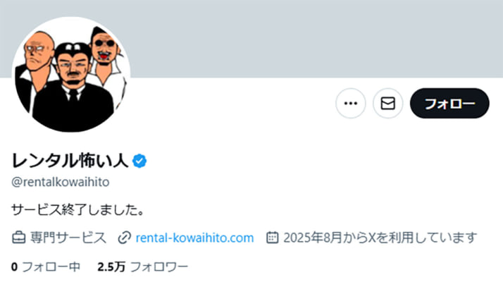 4枚目/6枚中 「レンタル怖い人」即サービス終了で《メンタル弱い人やん》 弁護士は「存在が脅迫行為」「犯罪の勧誘」のリスク指摘 社会2025年09月06日 26,000人いたフォロワーは日々減っている。復活を望む声も(公式Xより) 0