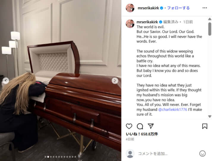 6枚目/6枚中 米国に激震「カーク氏射殺」 死で増した影響力が招く政情不安…「内戦さながらの衝突」「左派弾圧」よりも懸念すべき動きとは 国際2025年09月18日 エリカ・クラーク氏公式Instagram(@mrserikakirk)より 0