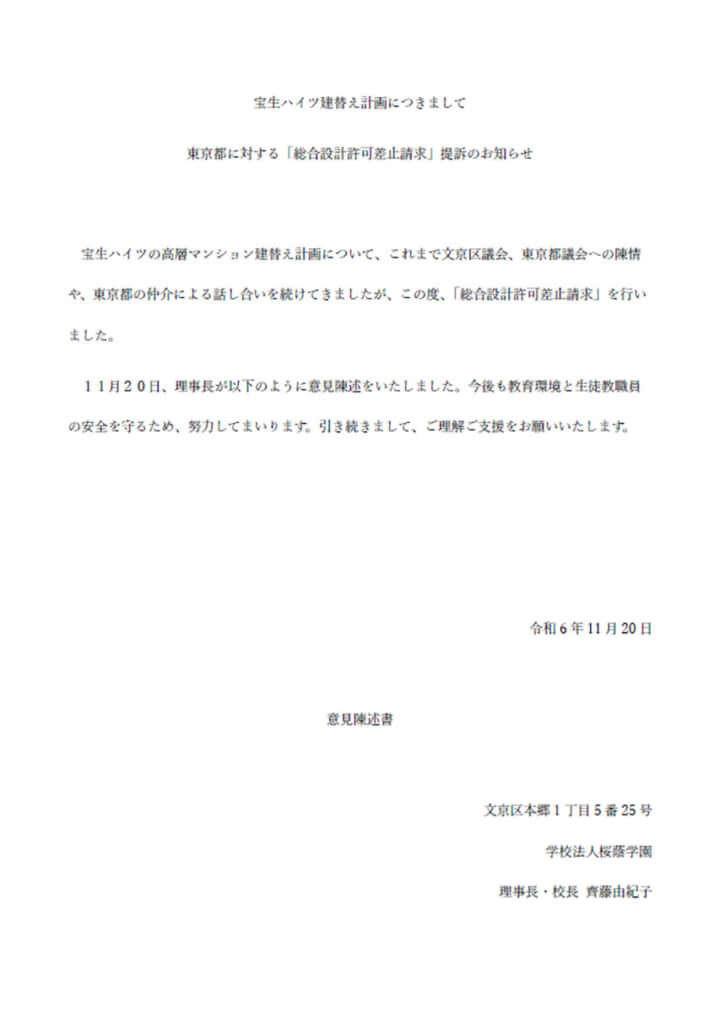 3枚目/6枚中 女子校トップ「桜蔭学園」を脅かす20階建てのマンション 権利?ハラスメント?騒動が浮き彫りにする日本の後進性 社会2025年09月19日 桜蔭学園がHP掲載した「宝生ハイツ建替え計画につきまして」(1/4) 0