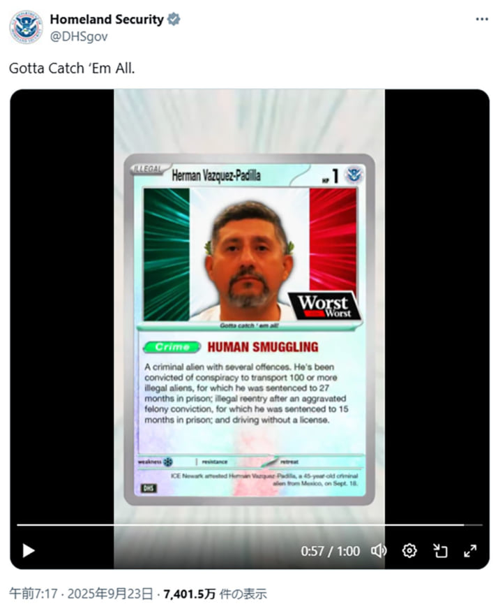 6枚目/6枚中 欧州は移民問題で「地獄に落ちる」と言ったトランプ氏…むしろ米国の状況が深刻化 内戦勃発の可能性は高まる一方 国際2025年10月02日 Homeland Security公式X(@DHSgov)より 0