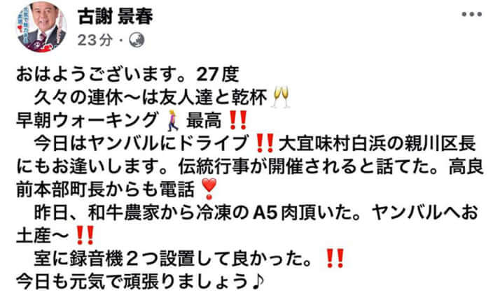 〈室に録音機2つ設置してよかった!!〉。被害女性を市長室に呼び出してこっそり録音していた? facebook大好き市長の「不穏な投稿」(2025年9月15日に投稿。現在は削除)